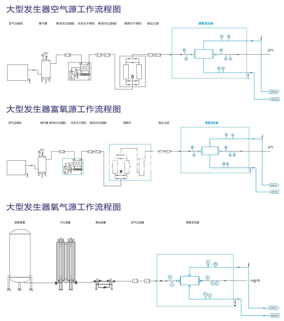 液氧源臭氧发生器系统,是将液氧站里的液态氧通过气化器气化成臭氧发生器所需的气态氧气再经过稳压装置稳压稳流之后流入臭氧放电室。
